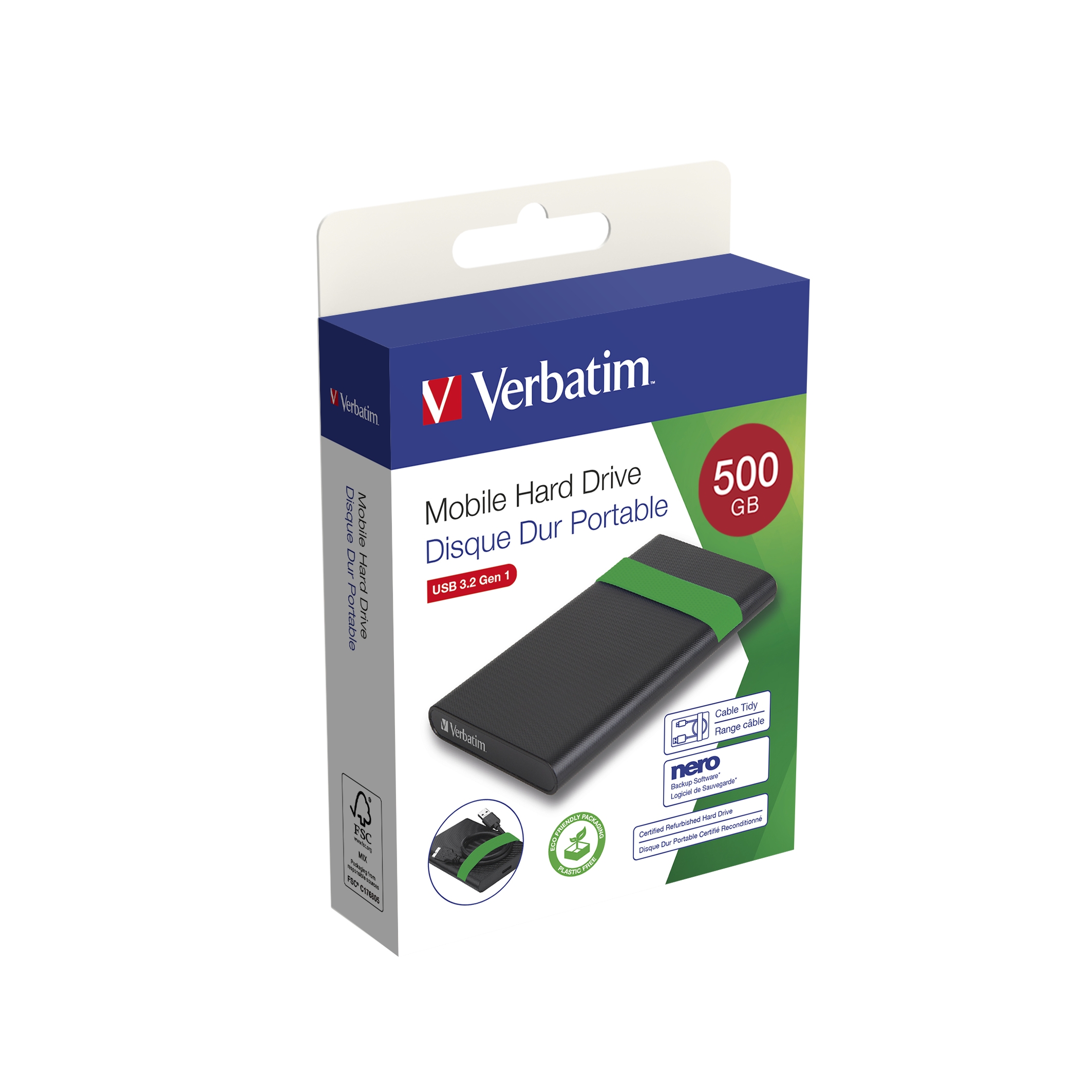 Verbatim 53111. Capacità hard disk: 512 GB, Dimensione hard disk: 2.5". Versione USB: 2.0/3.2 Gen 1 (3.1 Gen 1). Velocità di rotazione hard disk: 5400 Giri/min. Colore del prodotto: Nero, Verde